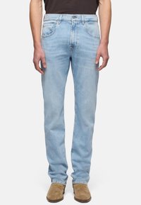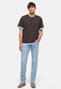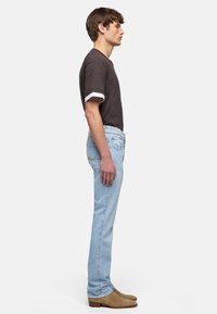 Uomo che indossa jeans aderenti azzurri chiaro e stivali in camoscio color cuoio, in piedi contro uno sfondo bianco.