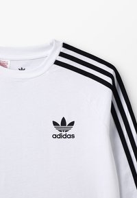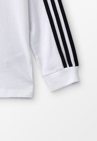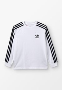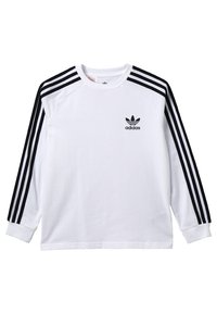 Maglietta bianca Adidas a maniche lunghe con dettagli a tre strisce nere sulle maniche e logo trefoil Adidas sul petto sinistro.