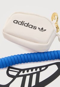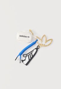 Portachiavi dorato con trifoglio Adidas, mini pochette bianca attaccata, lacci da scarpa blu e ciondolo a forma di sneaker bianco e nero.