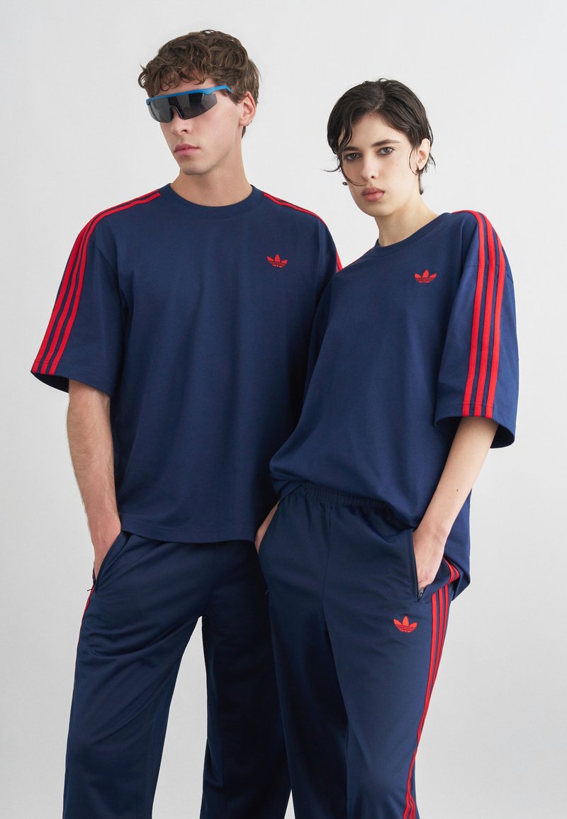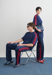 Due modelli indossano tute abbinate Adidas blu navy con strisce rosse e loghi, in piedi fianco a fianco su uno sfondo semplice.