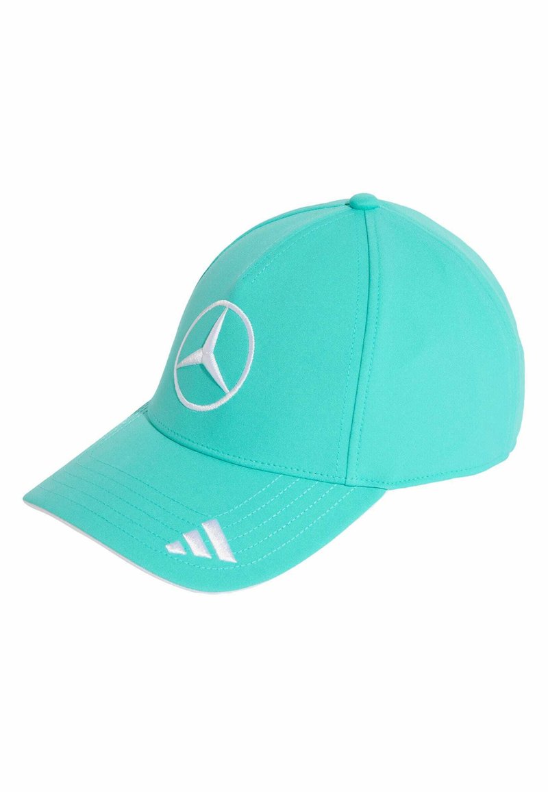 Berretto da baseball turchese in tessuto, con logo Mercedes bianco sulla parte anteriore e cuciture bianche sulla visiera e sul lato.