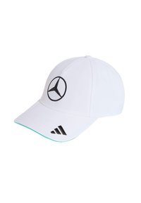 • Cappellino da baseball bianco con il logo Mercedes nero sulla parte anteriore e tre strisce nere Adidas sul lato, con un accento turchese sulla visiera.