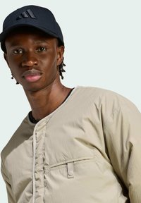 Giovane uomo con indosso una giacca imbottita beige senza collo, pantaloni color oliva e un cappellino nero Adidas, in piedi davanti a uno sfondo chiaro e semplice.