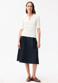 Donna con capelli castano chiaro che indossa una maglietta bianca a maniche corte con colletto e chiusura a occhiello, abbinata a una gonna scura plissettata.