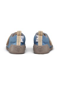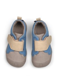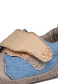Scarpa da tela blu con una cinghia beige in velcro, puntale grigio chiaro, suola in gomma texturizzata e un piccolo tirante sul retro.