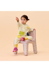 Bambino piccolo con pantaloni crema e calzini gialli con scarpe a suola morbida viola e gialla, in piedi contro uno sfondo beige.