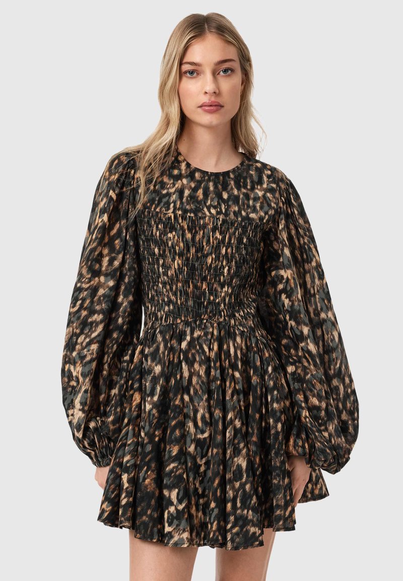 Vestito stampato leopardato con corpetto arricciato, maniche lunghe voluminose e gonna svasata. Realizzato in tessuto leggero dai toni naturali.