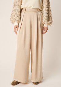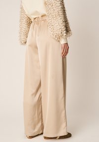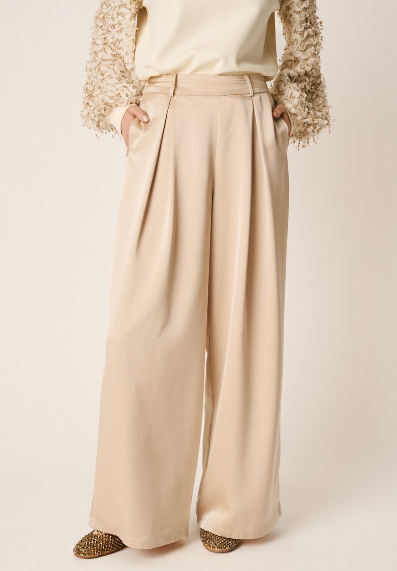 Pantaloni beige in raso a vita alta e gamba larga con tasche laterali, indossati con un top a maniche lunghe lavorato e decorato da motivi, e scarpe piatte impreziosite.