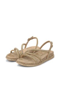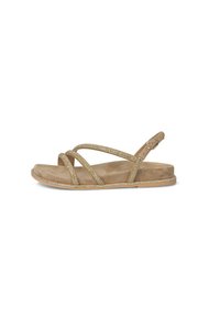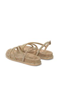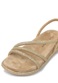 Piedi che indossano sandali beige con cinturini sotto una gonna bianca ricamata con motivi floreali ritagliati, seduti su una sedia di metallo.