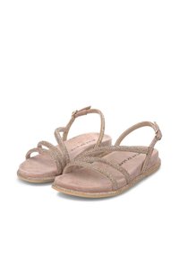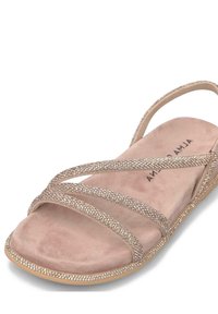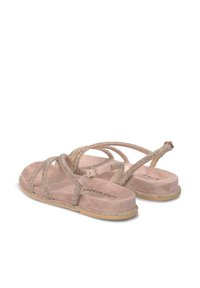 Donna con sandali piatti con cinturini color nudo e vestito bianco con pizzo a fiori traforato seduta su una sedia di metallo.