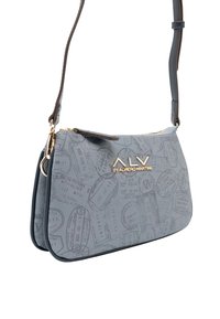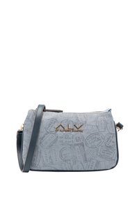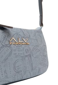 Piccola borsa a tracolla rettangolare azzurro chiaro con tracolla blu scuro, chiusura a zip, motivo con timbri da viaggio e logo dorato "ALV by Alviero Martini".