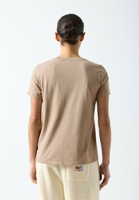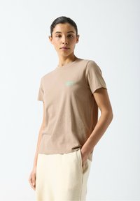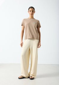 T-shirt in cotone marrone chiaro con scollo rotondo e maniche corte, con un piccolo logo verde sul petto. Pantaloni con coulisse color crema.