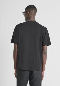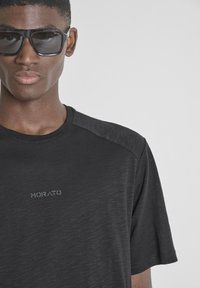 Persona alta con occhiali da sole neri oversize, camicia nera a maniche corte con la scritta "MORATO" e pantaloni neri, in piedi davanti a uno sfondo semplice.