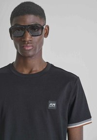 Uomo con maglietta nera a maniche corte con bordi delle maniche a righe e piccolo logo, pantaloni bianchi e grandi occhiali da sole scuri, contro uno sfondo semplice.
