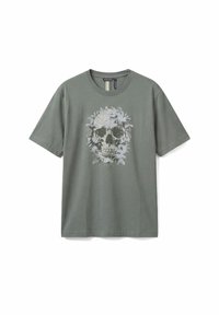 Uomo che indossa una maglietta bianca con un grande disegno di teschio circondato da foglie di palma stampate in tonalità di grigio e blu sul davanti.