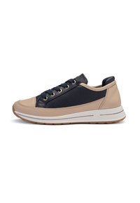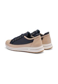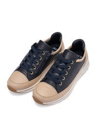 Sneakers blu navy e beige con tomaia in pelle liscia e tessuto, caratterizzate da occhielli dorati, un accento testurizzato e una suola bianca imbottita.