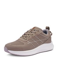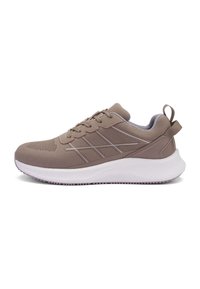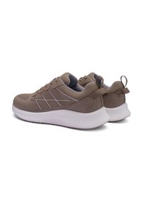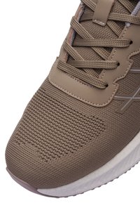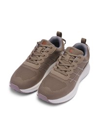 Scarpe sportive marroni con tomaia in mesh, suola flessibile, dettagli in tessuto e strisce riflettenti. Dotate di un anello sul tallone per facilitare la calzata.