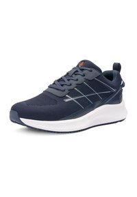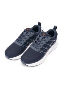 Scarpe sportive da uomo in rete blu navy con accenti grigi, suola in gomma, design con lacci e linguetta posteriore per una facile calzata. Presentano una tomaia testurizzata.