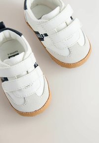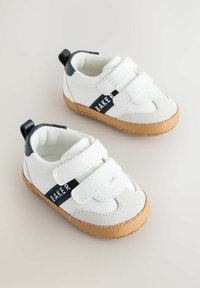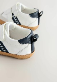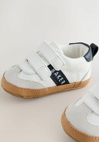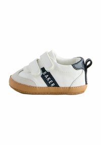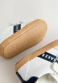 Scarpa bianca in pelle sintetica con dettagli in camoscio, cinturini regolabili con chiusura in Velcro, striscia blu navy con la scritta "BAKER" e suola in gomma marrone.