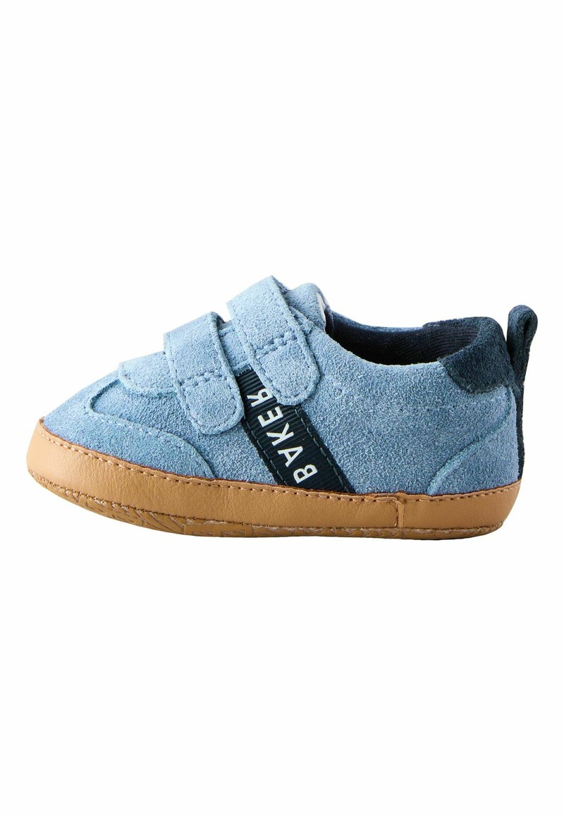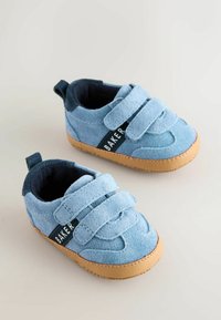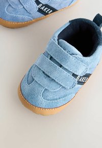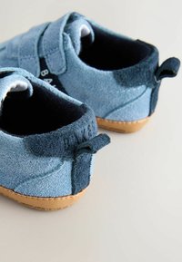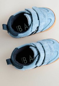 Scarpa per bambino in camoscio blu con doppia chiusura a strappo, suola in gomma color sabbia e striscia nera decorativa con testo bianco, dettaglio di design curvo.