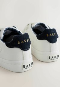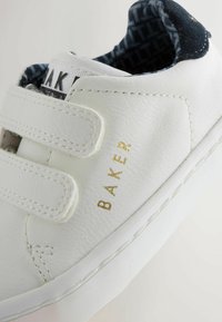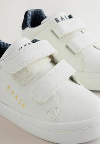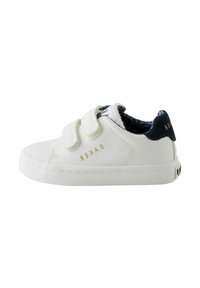 Sneakers in pelle bianca con due cinturini in Velcro, dettagli blu navy sul tallone e all'interno, e logo dorato sul lato. Punta arrotondata e suola piatta.