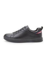 Sneaker in pelle blu navy con punta tonda, suola in gomma bianca, sei fori per i lacci e interno color miele. Presenta un accento a righe sul tallone.