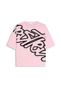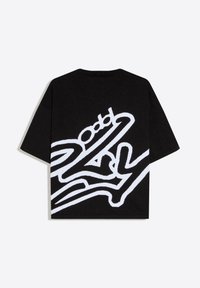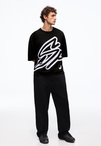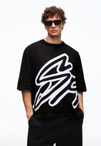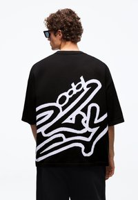 Giovane uomo con capelli ricci, occhiali da sole neri e una camicia nera oversize con un audace motivo astratto bianco, mani nelle tasche, sfondo neutro.