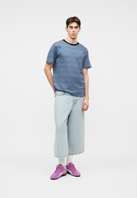 Giovane uomo che indossa una maglietta a righe blu e viola con colletto nero e jeans corti azzurri, in piedi davanti a uno sfondo neutro.