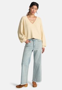 Maglione crema a maglia con scollo a V profondo, vestibilità ampia e maniche lunghe, abbinato a jeans azzurri.