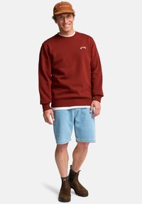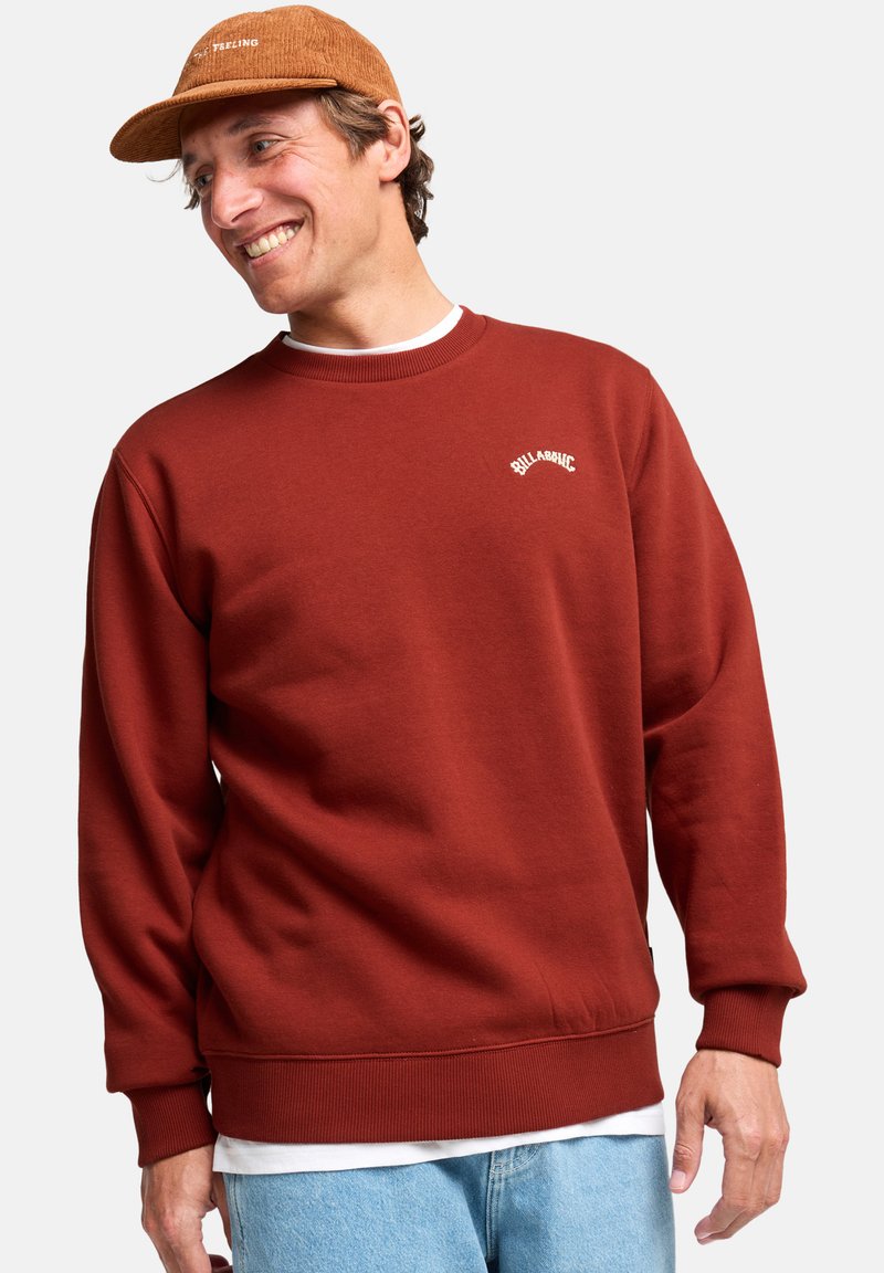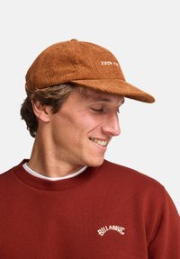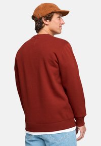 Felpa color marrone scuro con polsini e orlo a costine, con un piccolo logo bianco sul petto. Indossata con un cappellino beige e sovrapposta a una camicia bianca.