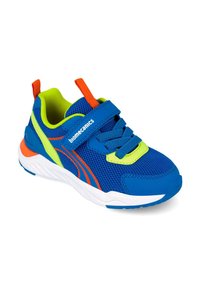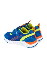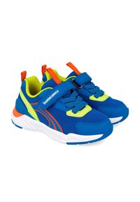 Scarpa da ginnastica per bambini blu e giallo neon con accenti arancioni, tessuto in rete, suola bianca e cinturino in Velcro con la scritta "Biomecanics".