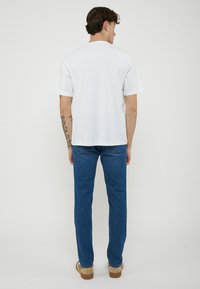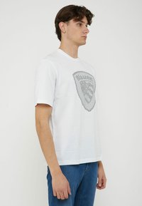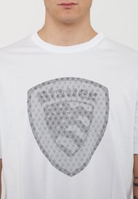 Giovane uomo con capelli castani corti che indossa una maglietta bianca con un motivo a scudo e jeans blu, in piedi davanti a uno sfondo uniforme.