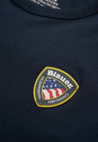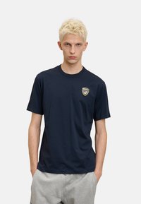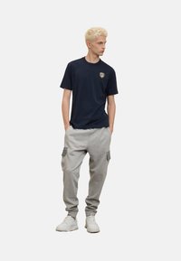 Giovane uomo con capelli biondi corti che indossa una maglietta blu navy con una piccola toppa sul petto e pantaloni della tuta grigio chiaro, sfondo neutro.