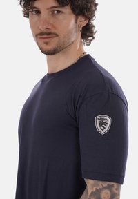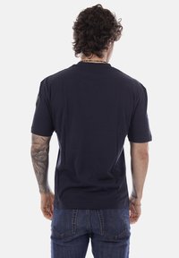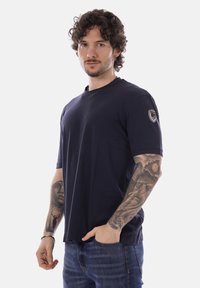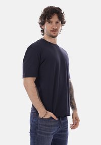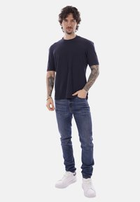 Uomo con capelli ricci e tatuaggi su entrambi gli avambracci indossa una maglietta blu scuro e jeans blu, in piedi con una mano in tasca.