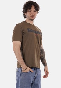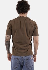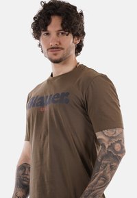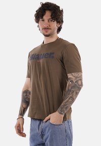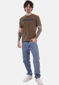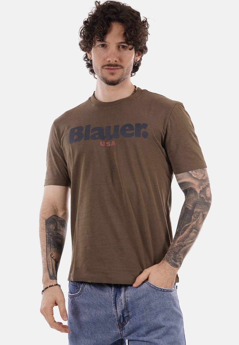 Uomo con capelli ricci che indossa una maglietta marrone "Blauer USA" e jeans blu, che mostra tatuaggi dettagliati in bianco e nero su entrambi gli avambracci.