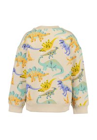 Ragazzo biondo con una felpa color crema con illustrazioni di dinosauri colorati e pantaloni cargo blu navy, in piedi davanti a uno sfondo semplice.