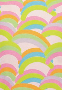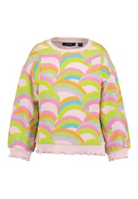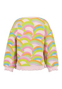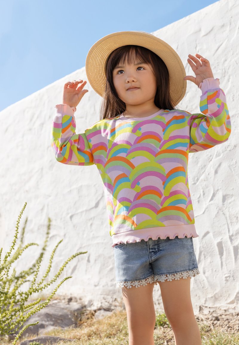 Felpa a maniche lunghe colorata con motivo arcobaleno, base rosa e orlo arricciato; abbinata a shorts di denim con rifinitura in pizzo.