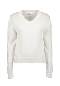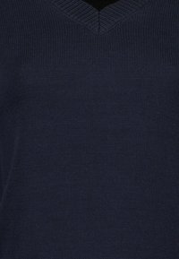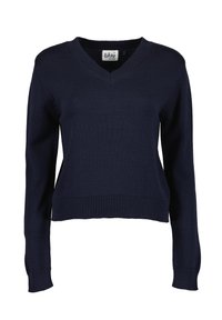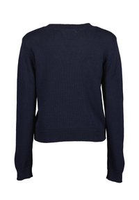 Maglione lavorato a maglia blu navy con scollatura a V, maniche lunghe e polsini e orlo a costine. Texture liscia, design corto e etichetta visibile all'interno.