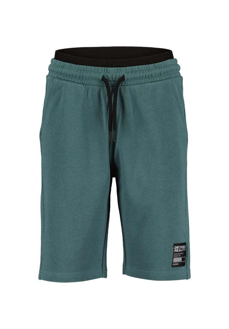 Pantaloncini turchesi realizzati in morbido cotone, con vita elasticizzata dotata di coulisse nera e etichetta laterale con marchio.