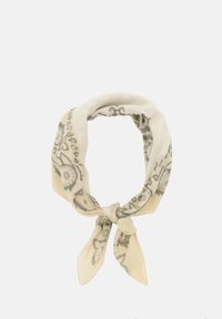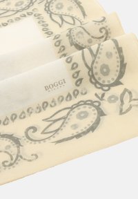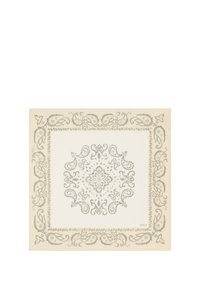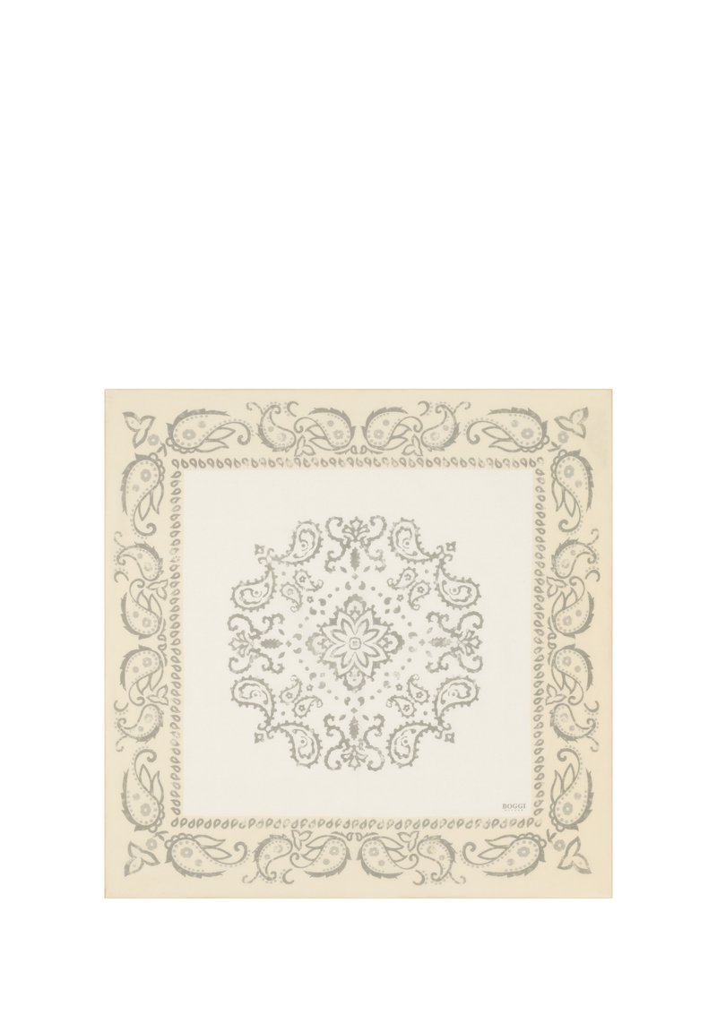 Tessuto quadrato color crema con motivi simmetrici grigi a paisley e floreali al centro e lungo il bordo.