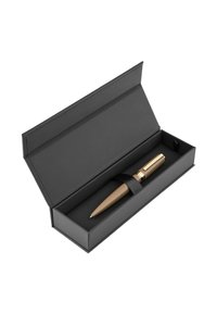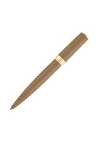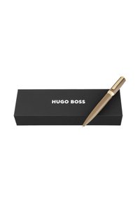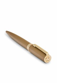 Penna a sfera marrone con clip e rifiniture dorate, con la scritta "Hugo Boss" incisa sulla fascia dorata vicino al cappuccio.