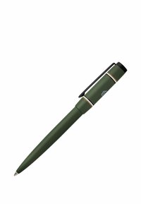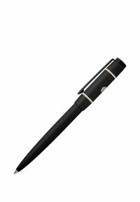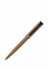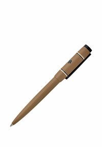 Penna a sfera marrone con clip nero e anello bianco vicino al cappuccio, mostrata su sfondo bianco.
