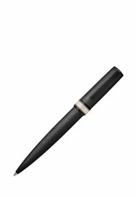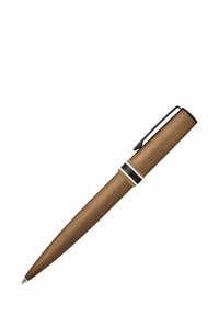 Penna marrone opaca con clip nero e fascia argento vicino alla parte superiore, punta affilata, isolata su sfondo bianco.