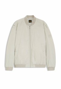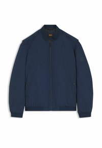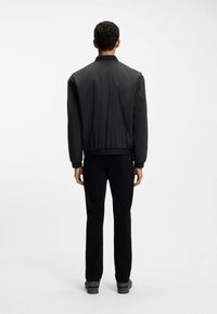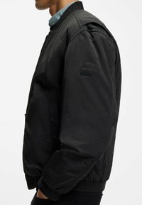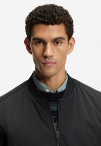 Uomo che indossa una giacca bomber nera sopra un maglione a motivi e una camicia con colletto, in piedi con una mano in tasca davanti a uno sfondo semplice.
