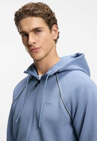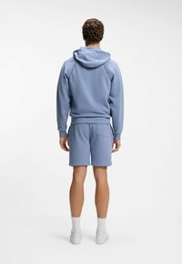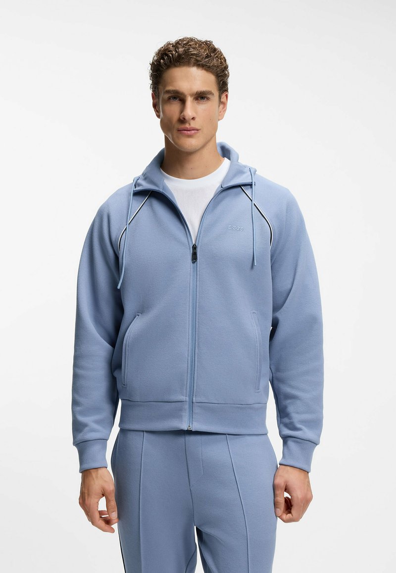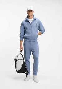 Uomo che indossa una felpa con cappuccio azzurro chiaro con cerniera e pantaloni coordinati, con una maglietta bianca sotto, in piedi davanti a uno sfondo bianco.