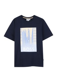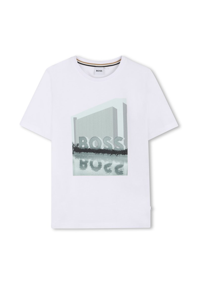 Maglietta bianca a maniche corte con una grafica di un edificio e la parola "BOSS" riflessa nell'acqua al centro davanti.