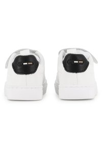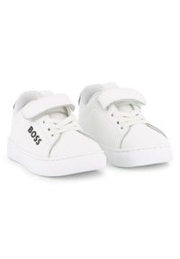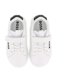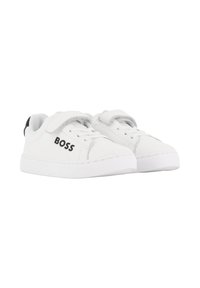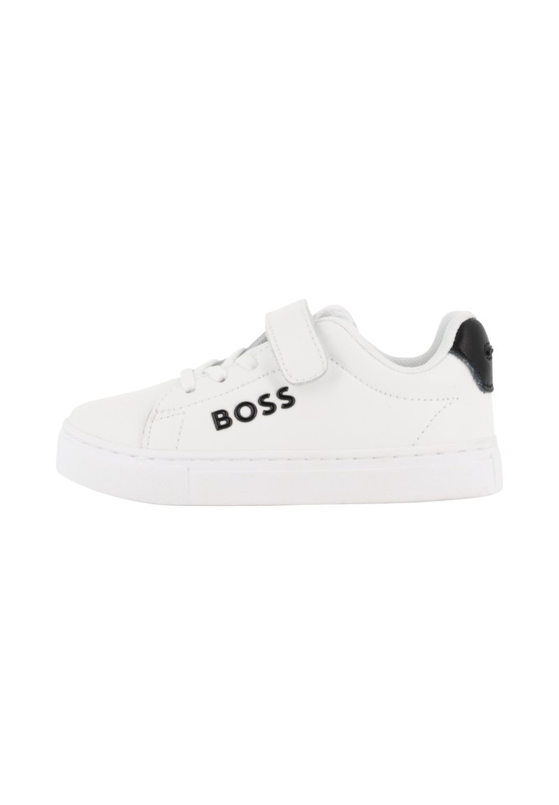 Sneaker bianca con tomaia sintetica liscia, dettaglio nero sul tallone, chiusura a strap e suola in gomma testurizzata. Presenta il logo "BOSS" sul lato.
