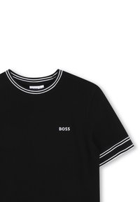Maglietta nera a maniche corte con doppie strisce bianche sul colletto e sui bordi delle maniche, e logo "BOSS" sul lato sinistro del petto.