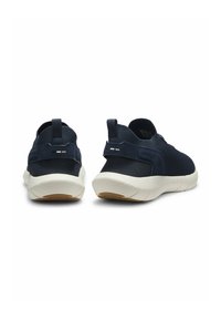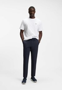 Uomo in piedi con le mani nelle tasche che indossa una t-shirt BOSS bianca, pantaloni blu navy e sneakers blu navy su sfondo bianco.