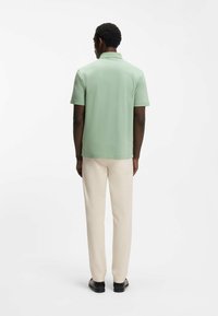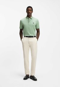 Polo a maniche corte verde chiaro con abbottonatura a due bottoni e logo ricamato; indossata con pantaloni beige e cintura nera.